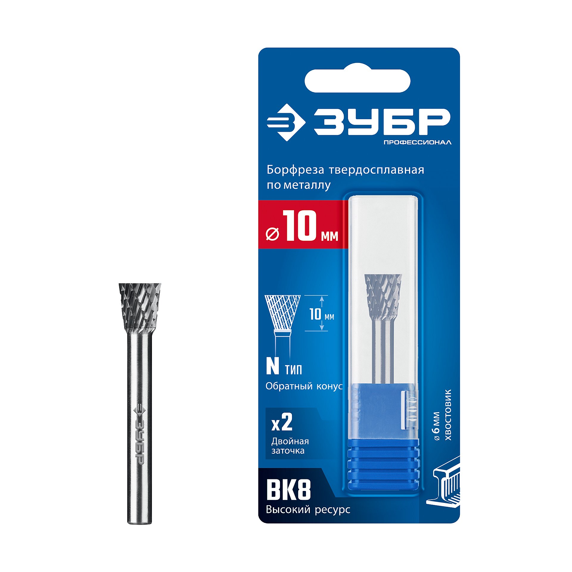 ЗУБР 10х10 мм, тип N (обратный конус, угол 13°), хв-к 6 мм, твердосплавная борфреза, ПРОФЕССИОНАЛ (28812-10-10)