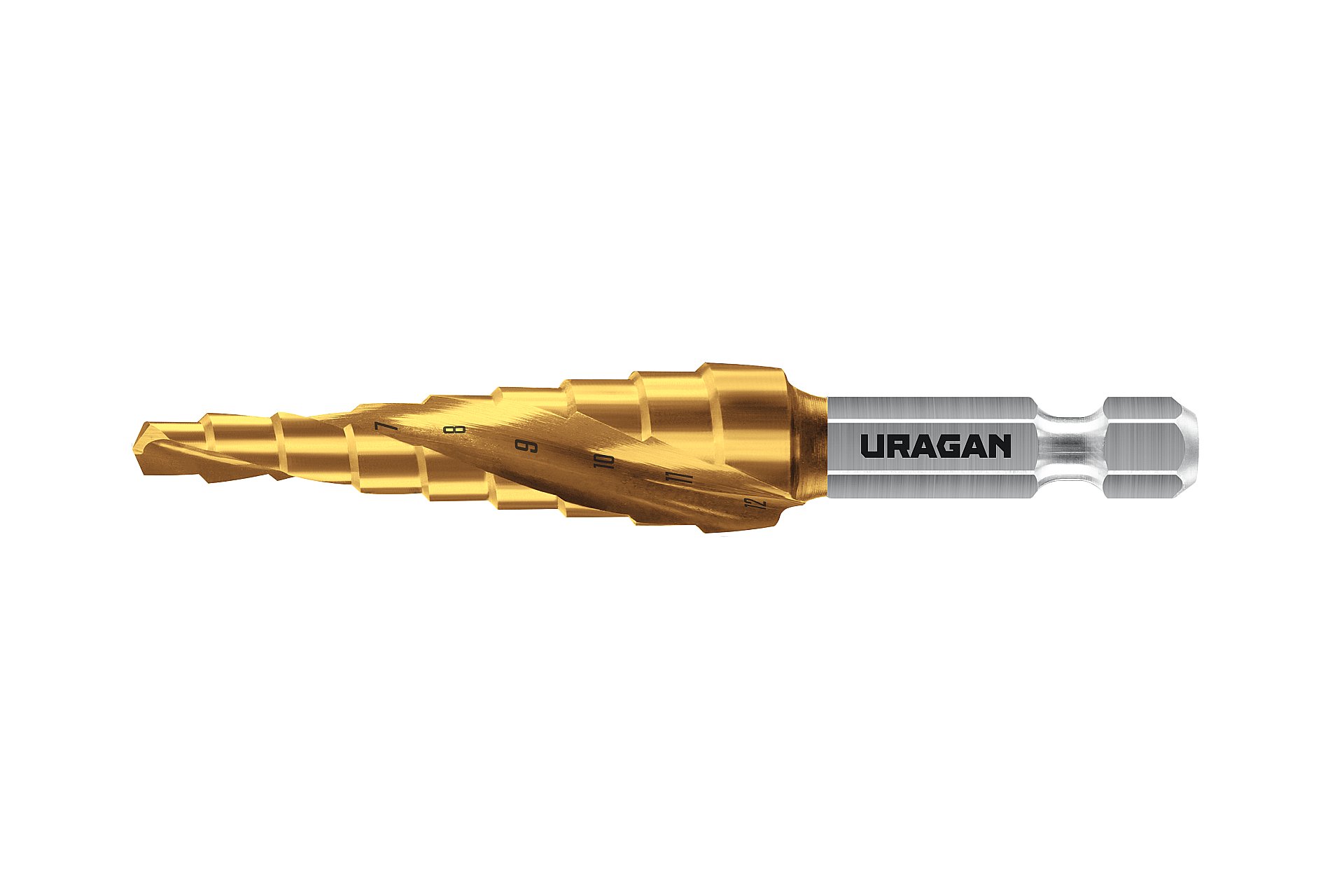 URAGAN 4-12мм, 9 ступеней, винтовая спираль, сверло ступенчатое(29658-4-12-9)