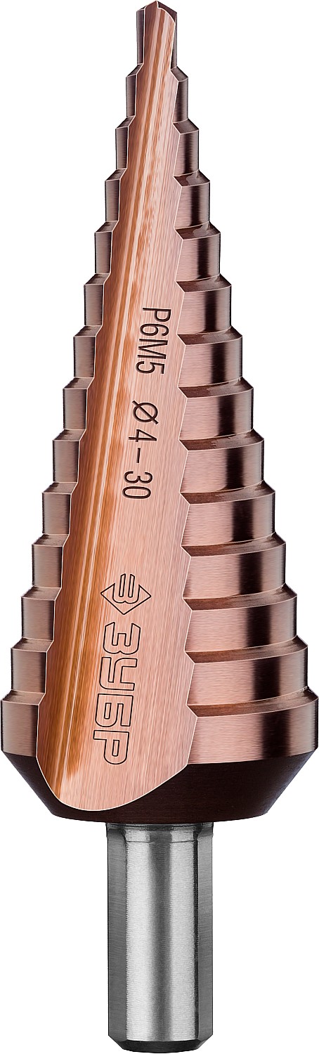 ЗУБР Кобальт, 4-30 мм, 14 ступеней, сталь Р6М5, кобальтовое покрытие, ступенчатое сверло, Профессионал (29672-4-30-14)