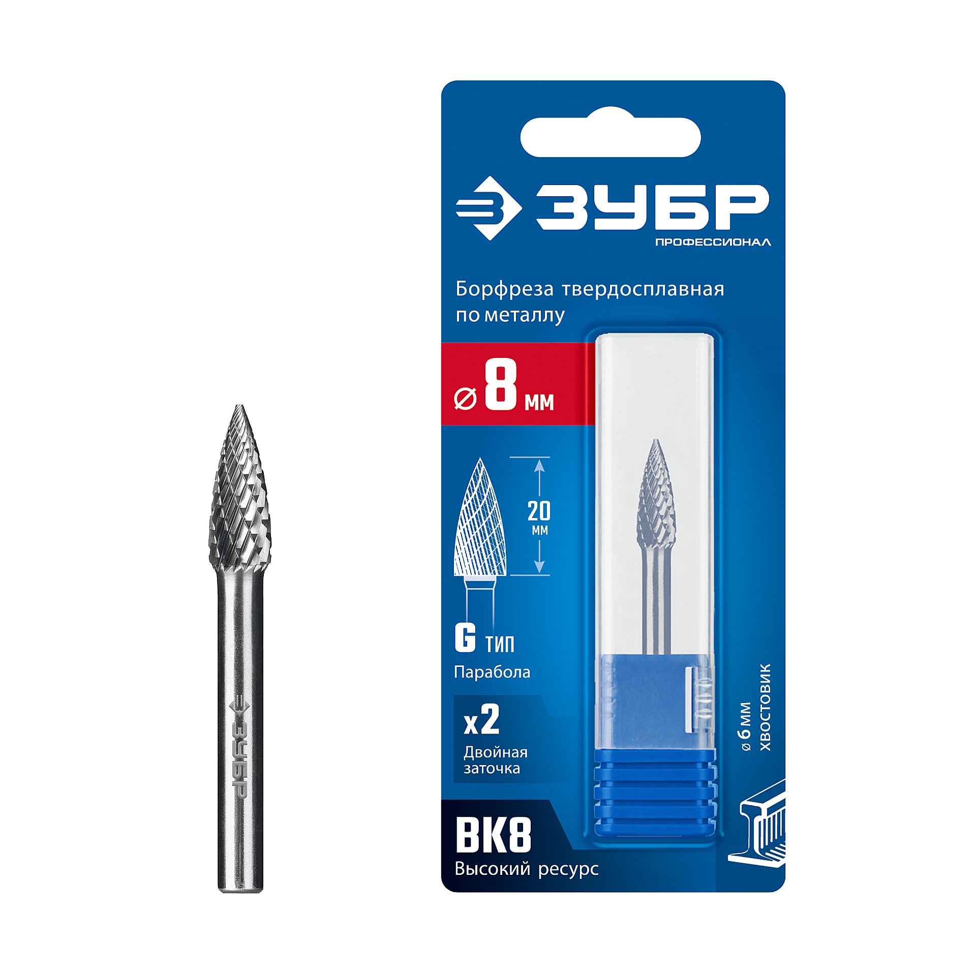 ЗУБР 8х20 мм, тип G (парабола с острым углом), хв-к 6 мм, твердосплавная борфреза, ПРОФЕССИОНАЛ (28806-8-20)