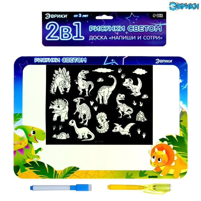 Набор для рисования светом «Динозавры» + доска напиши и сотри, ручка с фонариком, маркер