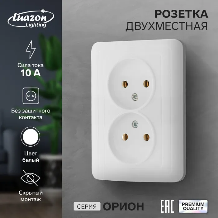 Розетка двухместная Luazon Lighting "Орион", 10 А, скрытая, без з/к, белая
