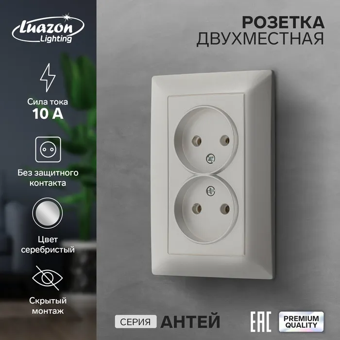 Розетка двухместная Luazon Lighting "Антей", 10 А, скрытая, без з/к, серебристая