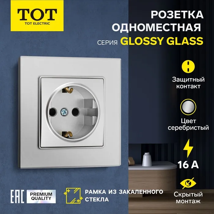 Розетка одноместная TOT Glossy Glass, 16 А, скрытая, с з/к, стекло, серебристая
