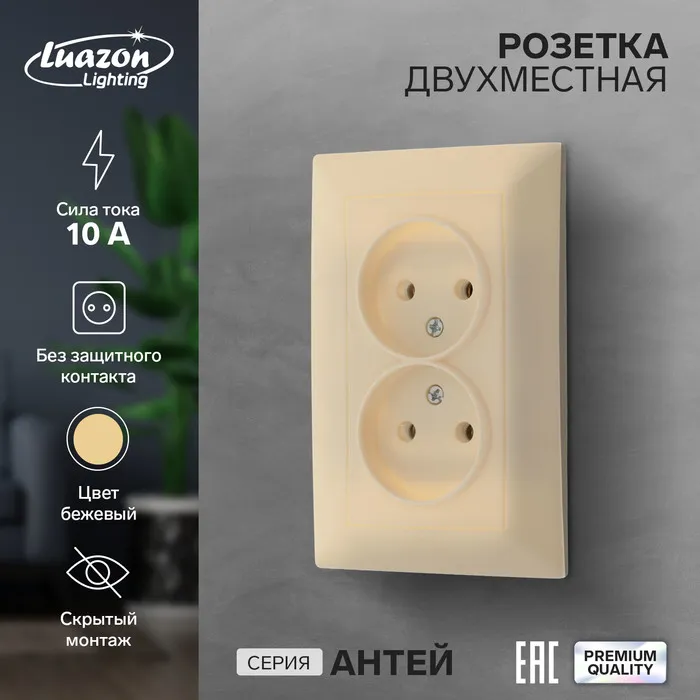 Розетка двухместная Luazon Lighting "Антей", 10 А, скрытая, без з/к, бежевая