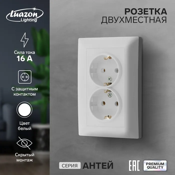 Розетка двухместная Luazon Lighting "Антей", 16 А, скрытая, с з/к, белая