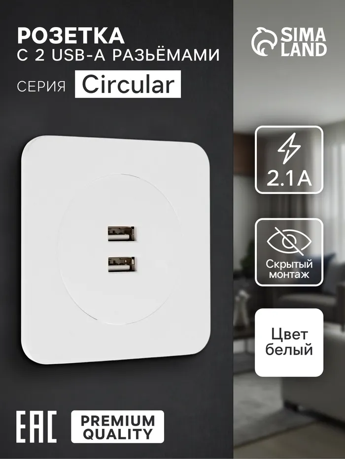 Розетка с 2 USB-A разъёмами, 2.1 А, 5 В, серия Circular, скрытый монтаж, белая