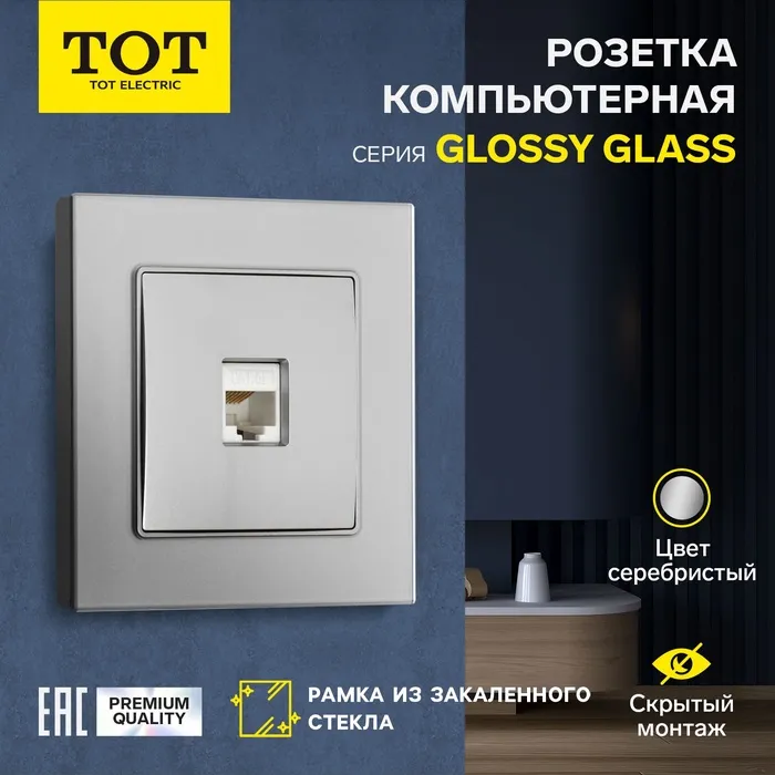 Розетка компьютерная одноместная TOT Glossy Glass, скрытая, стекло, серебристая
