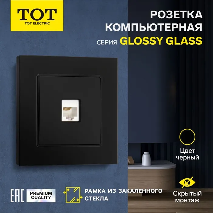 Розетка компьютерная одноместная TOT Glossy Glass, скрытая, стекло, черная