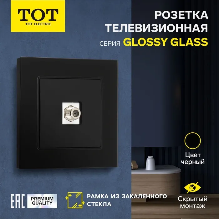 Розетка телевизионная одноместная TOT Glossy Glass, скрытая, стекло, черная