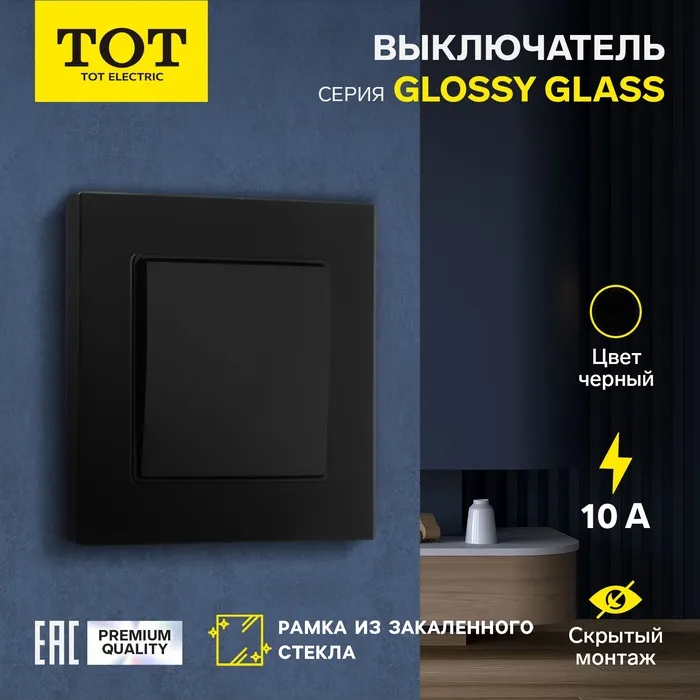 Выключатель проходной TOT Glossy Glass, 10 А, 1 клавиша, скрытый, стекло, черный