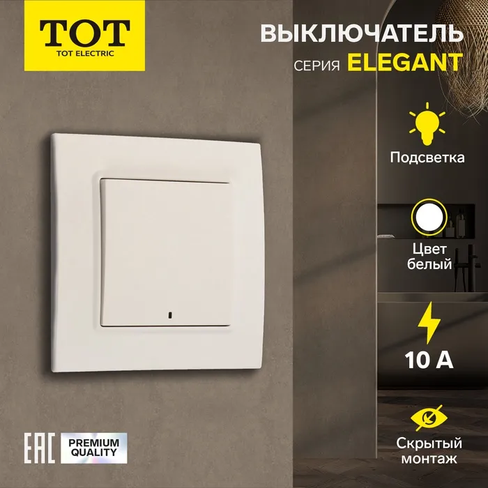 Выключатель TOT Elegant, 10 А, 1 кл., с подсветкой, скрытый, белый
