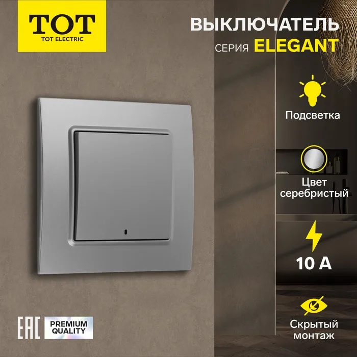Выключатель TOT Elegant, 10 А, 1 кл., с подсветкой, скрытый, серебристый