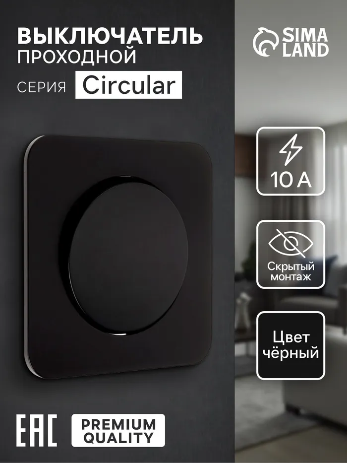 Выключатель проходной, серия Circular, 10 А, одноклавишный, скрытый монтаж, чёрный