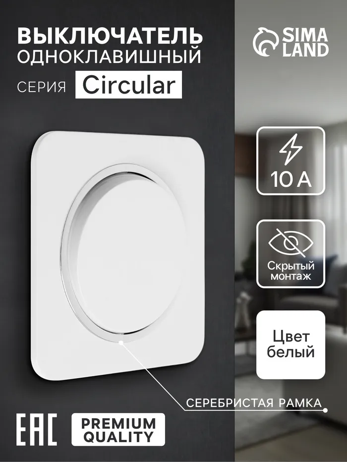 Выключатель, серия Circular, 10 А, одноклавишный, скрытый монтаж, серебристая рамка, белый