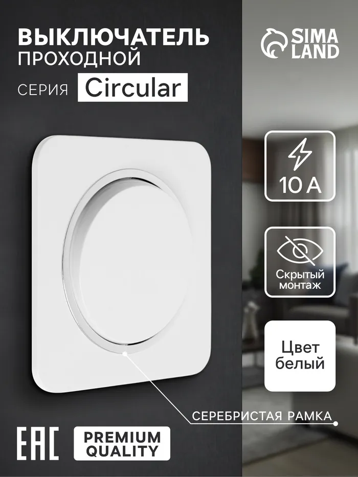Выключатель проходной, серия Circular, 10 А, одноклавишный, скрытый монтаж, серебристая рамка, белый