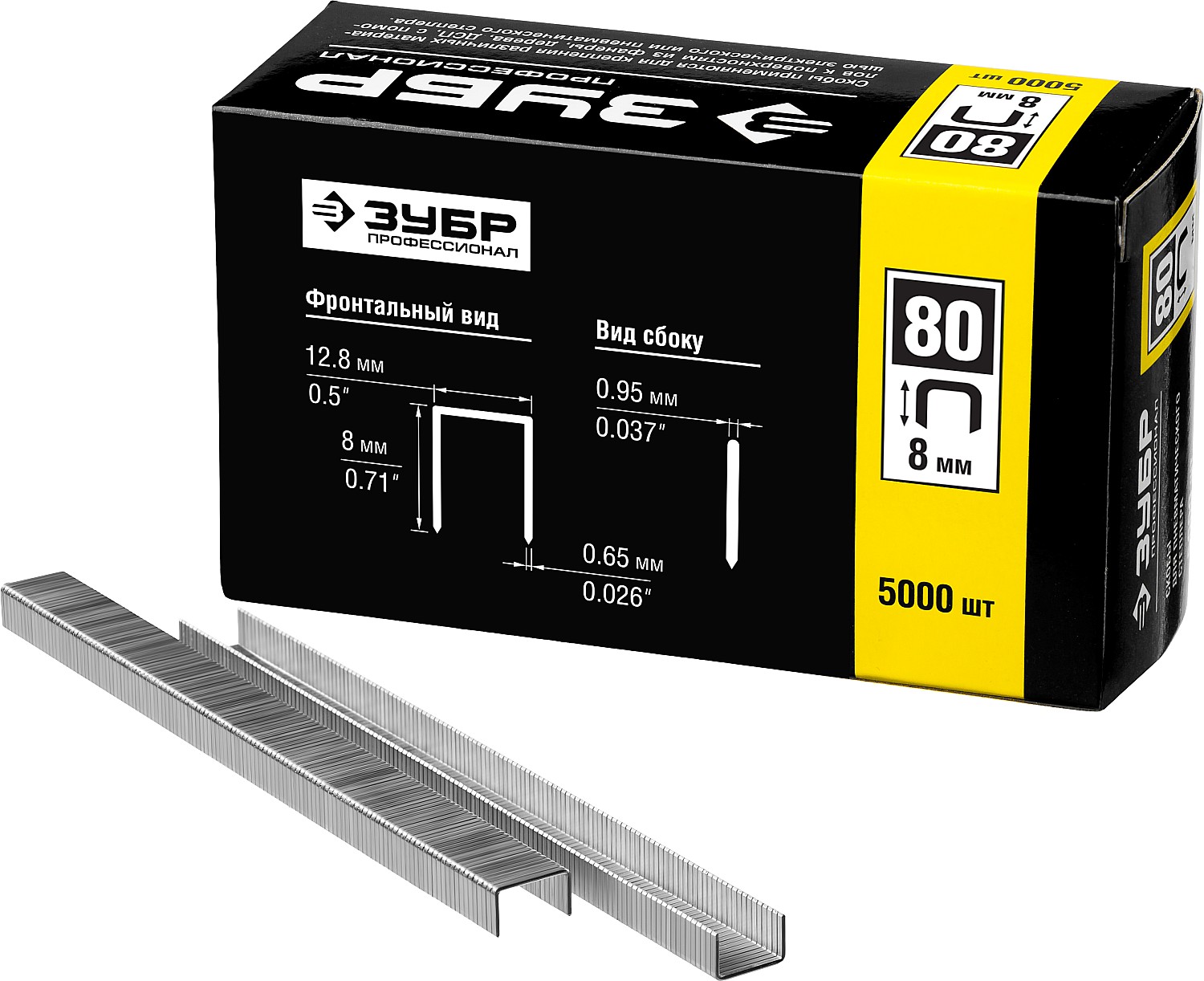 ЗУБР тип 21GA (80/Pr A/Senco AT) 8 мм, 5000 шт, скобы для степлера, Профессионал (31880-08)