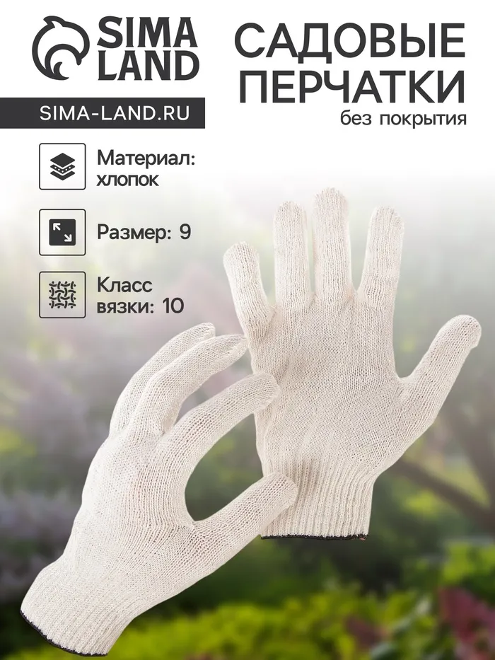 Перчатки садовые, хб, вязка 10 класс, 4 нити, размер 9, без покрытия, белые
