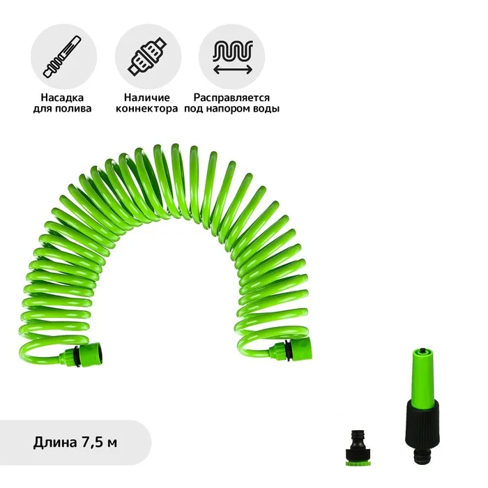 Шланг поливочный спиральный, 7,5 м, быстросъёмный, с насадкой для полива и штуцером, зелёный, Greengo