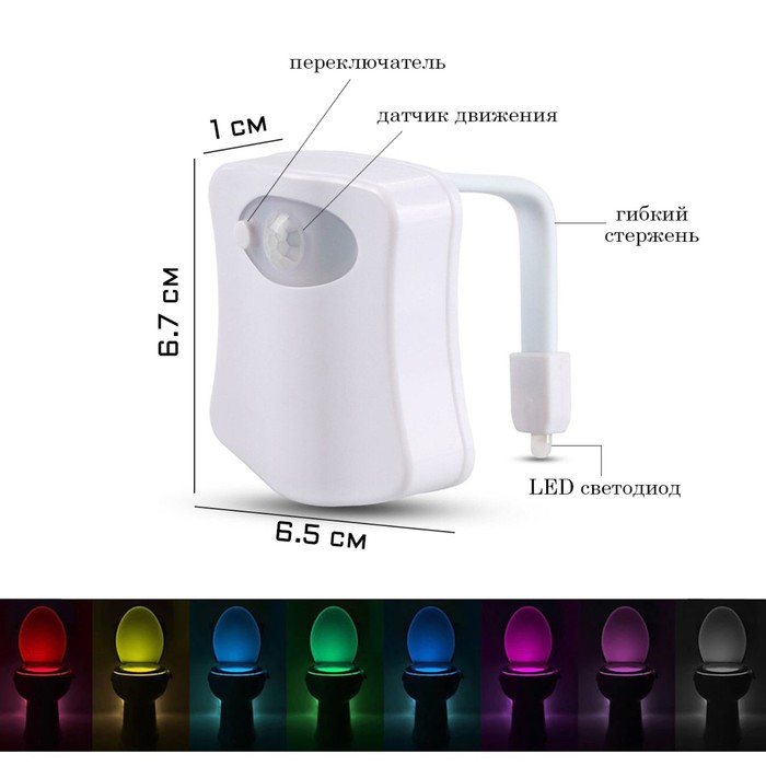 Фонарь для унитаза с датчиком движения, 0.1 Вт, 16 режимов, LED, 6.7 х 6.5 см, 3 AAA