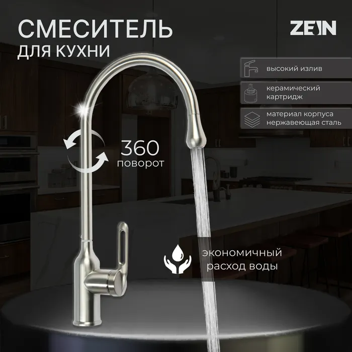 Смеситель для кухни ZEIN Z2750, высокий, картридж 35 мм, нержавеющая сталь, сатин