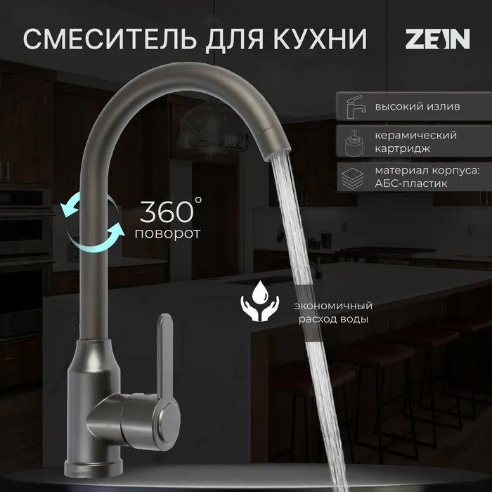 Смеситель для кухни ZEIN Z3700, однорычажный, поворотный излив высотой 26 см, графит