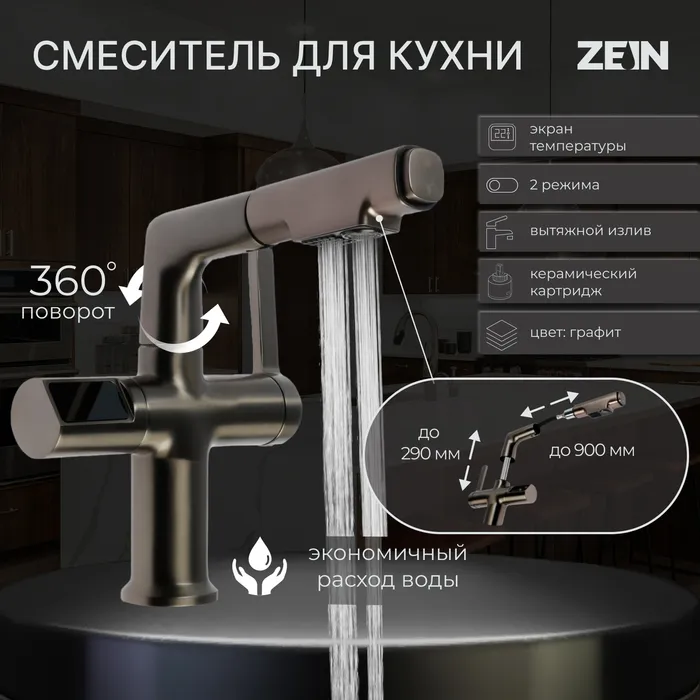 Смеситель для кухни ZEIN Z3782, экран температуры, вытяжной излив, высота 18-25 см, 2 режима