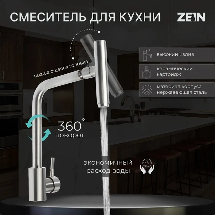 Смеситель для кухни ZEIN ZS-1, «микрофон», картридж 35 мм, нержавеющая сталь, сатин