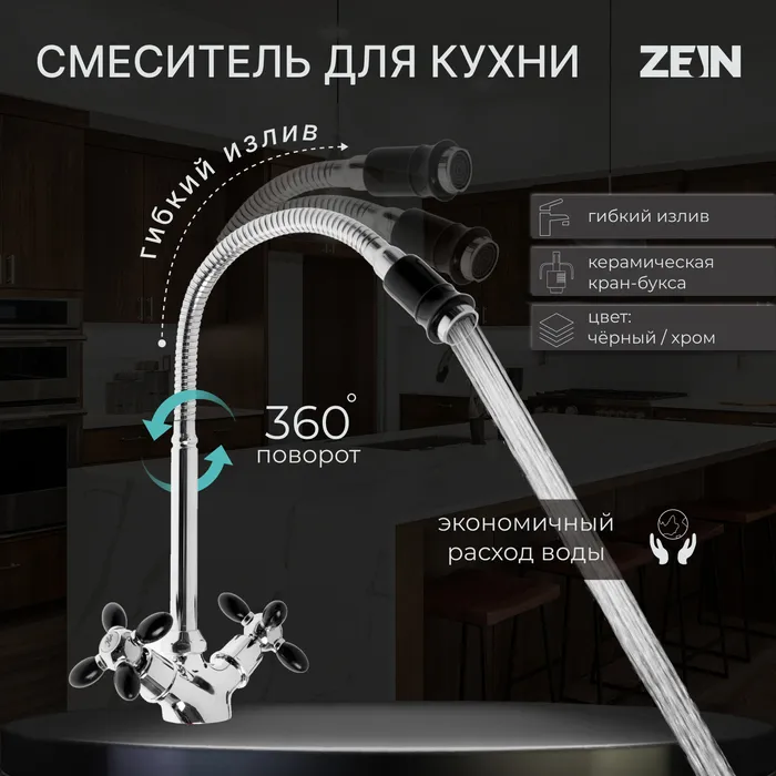Смеситель для кухни ZEIN ZC2029, гибкий излив, кран-букса латунь 1/2", черный/хром