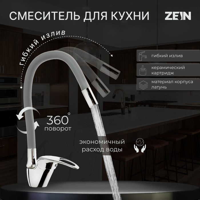 Смеситель для кухни ZEIN Z2075G, силиконовый излив, картридж 40 мм, латунь, серый/хром