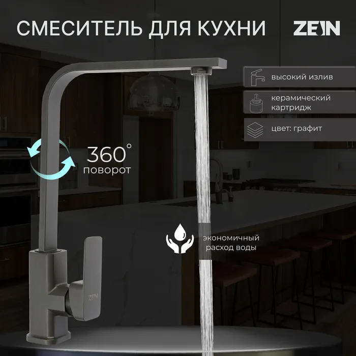 Смеситель для кухни ZEIN Z3762, однорычажный, высота излива 34 см, графит