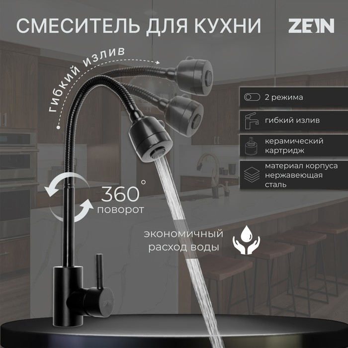 Смеситель для кухни ZEIN Z2391, гибкий излив, картридж 35 мм, нержавеющая сталь, черный