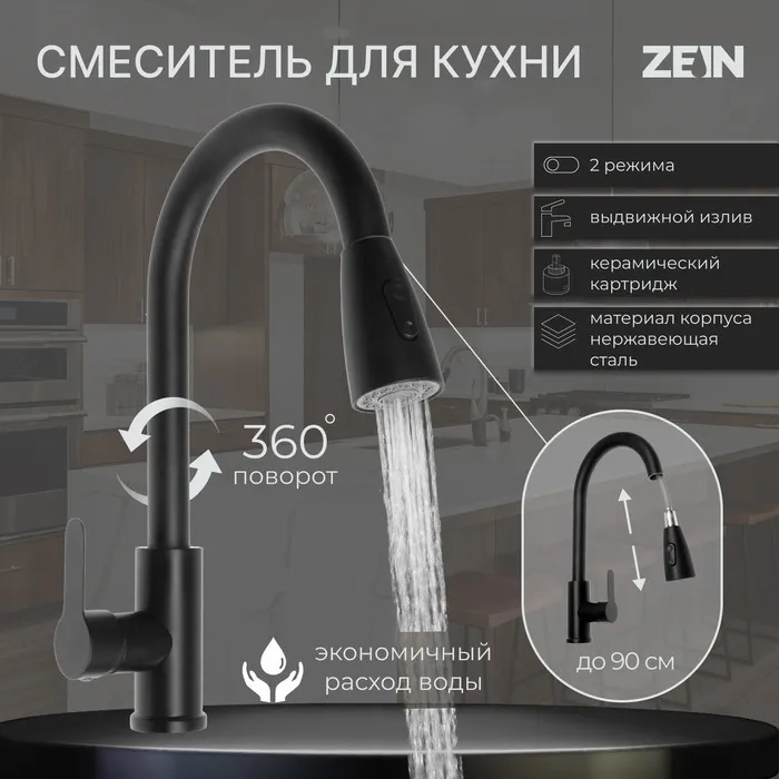 Смеситель для кухни ZEIN Z7212, кран для питьевой воды, с выдвижной лейкой, латунь, черный