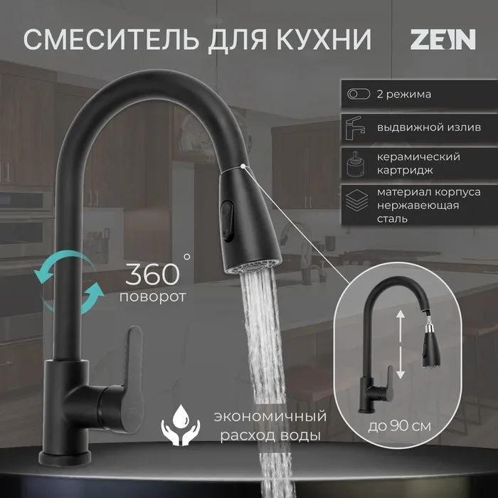 Смеситель для кухни ZEIN Z1299, однорычажный, выдвижная лейка, латунь, черный