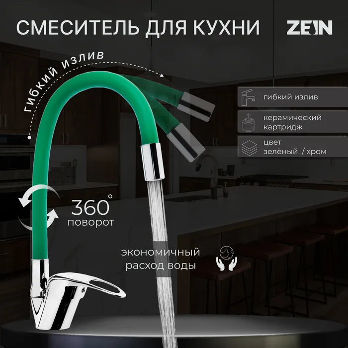Смеситель для кухни ZEIN Z2109, однорычажный, гибкий излив, картридж 40 мм, зеленый/хром