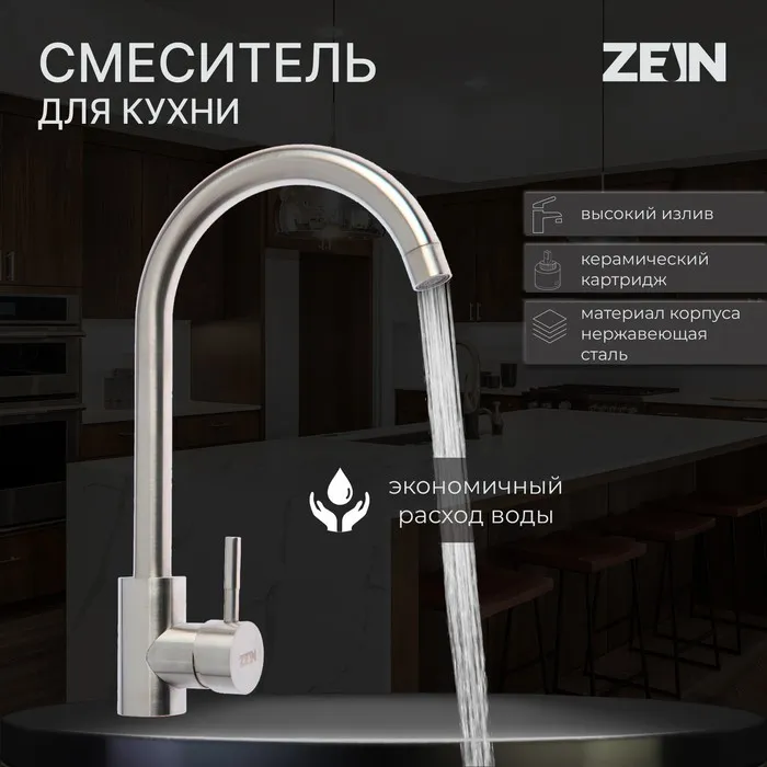 Смеситель для кухни ZEIN Z2386, однорычажный, картридж 35 мм, нержавеющая сталь, сатин