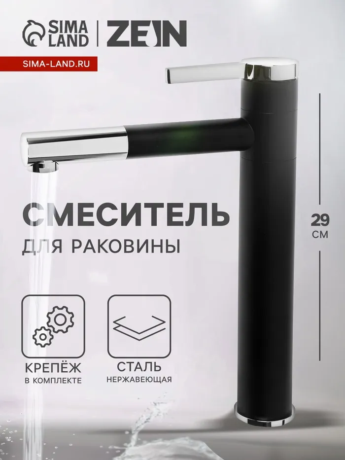 Смеситель для раковины ZEIN ZF-013, высокий, картридж керамика 35 мм, латунь, черный/хром