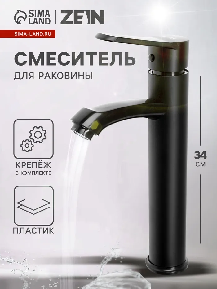 Смеситель для раковины ZEIN Z3723, однорычажный, длина излива 12 см, высокий, пластик, черный