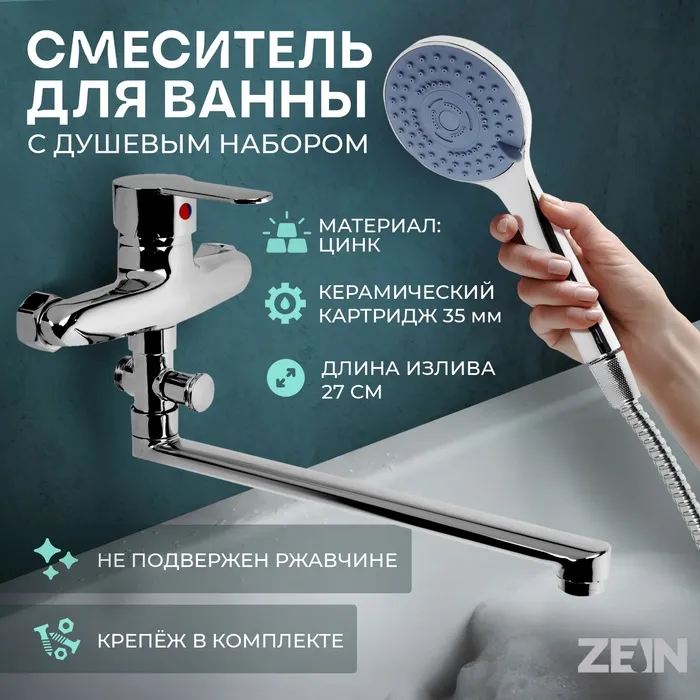Смеситель для ванны ZEIN Z3378, картридж 35 мм, с душевым набором, лейка 4 режима, хром
