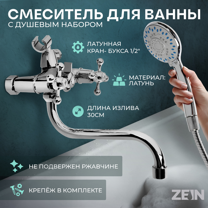 Смеситель для ванны ZEIN Z2079CR, кран-букса латунь 1/2", с душевым набором, латунь, хром