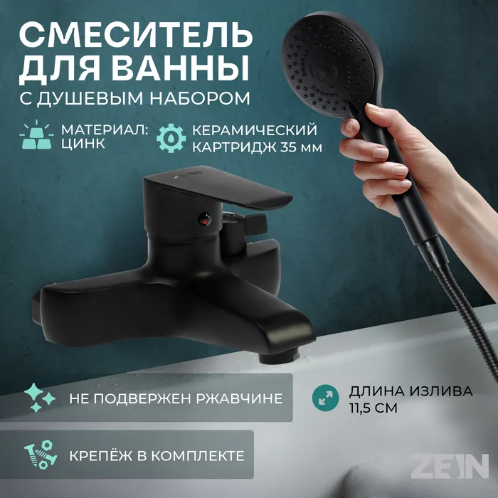 Смеситель для ванны ZEIN Z3837, однорычажный, душевой набор, черный