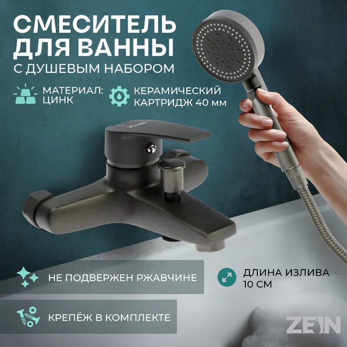 Смеситель для ванны ZEIN Z3842, однорычажный, душевой набор, лейка 5 режимов, графит