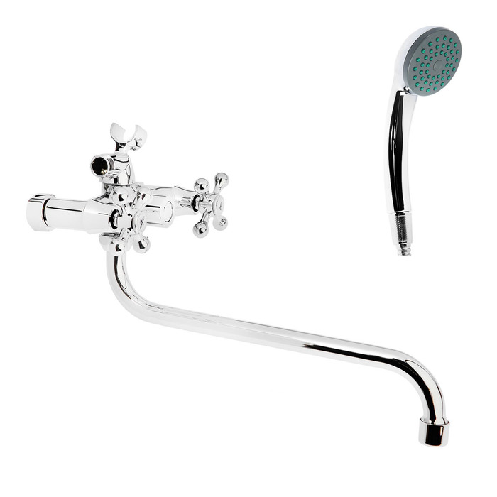 Смеситель для ванны ZEIN Z3731, двухвентильный, излив 33 см, лейка, шланг, сатин