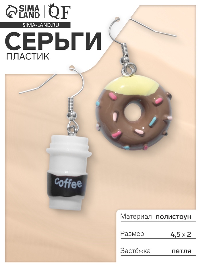 Серьги пластик «Кофе с пончиком», цветные в серебре