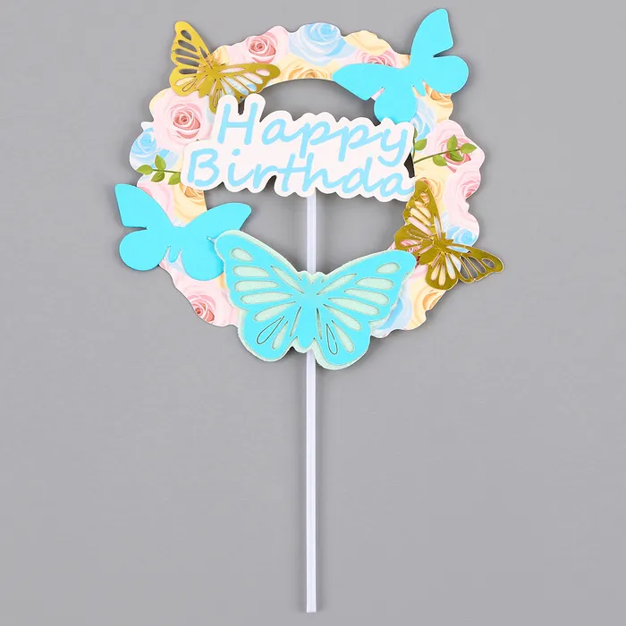 Топпер для торта «С днём рождения» с бабочками, голубой