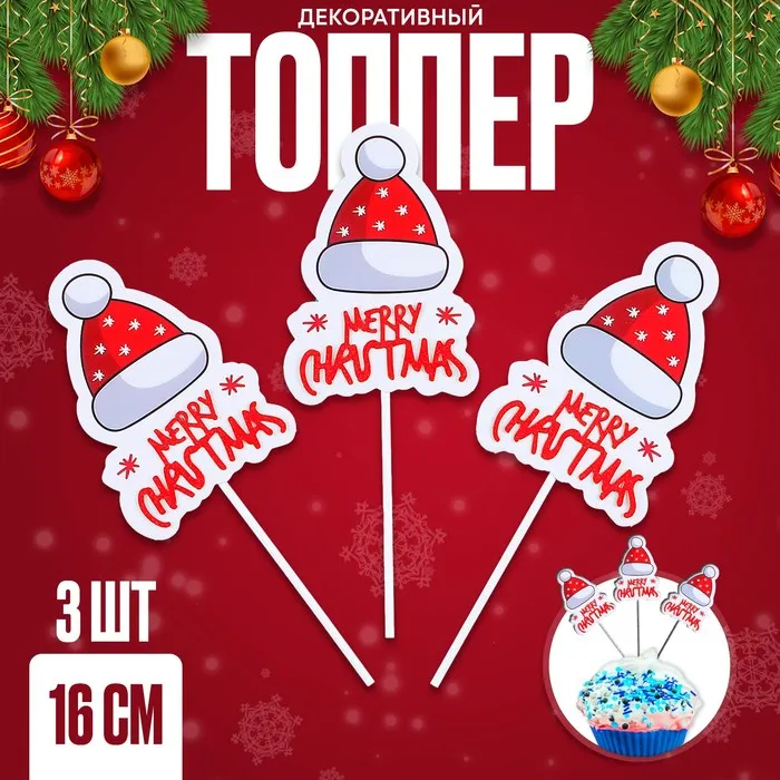 Топпер новогодний для торта «Merry Christmas», 3 шт.