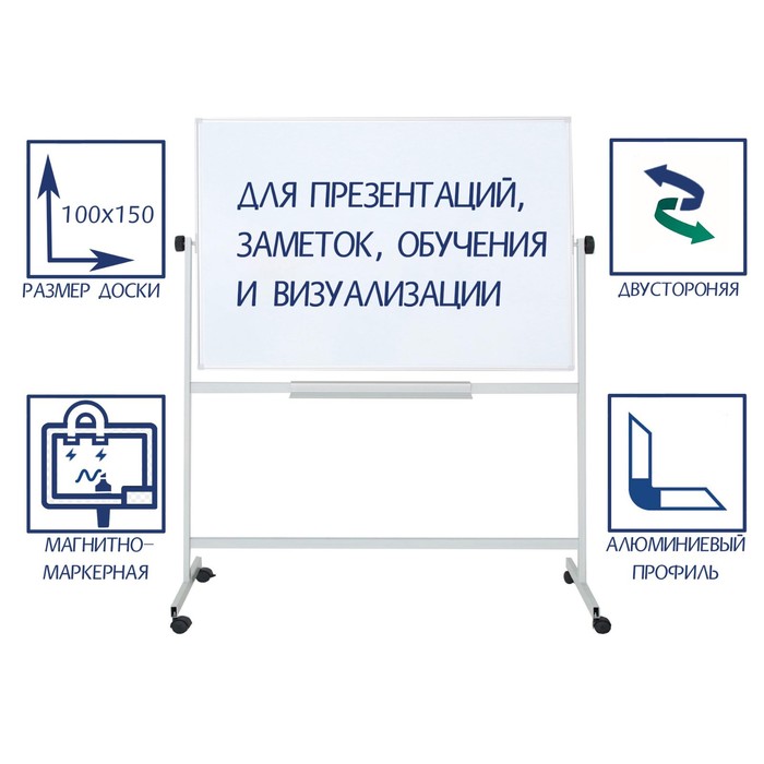 Доска магнитно-маркерная двусторонняя 100×150 см, Calligrata ЭКОНОМ, поворотная на мобильном стенде, с центральным фиксатором, в алюминиевой рамке, с полочкой