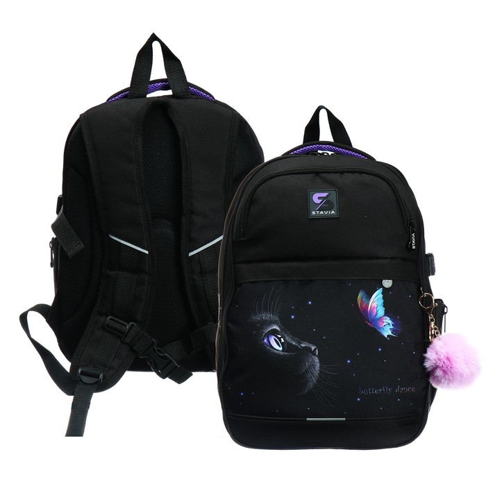 Рюкзак молодёжный, 40×28×18 см, эргономичная спинка, Stavia «Кошка с бабочкой», чёрный