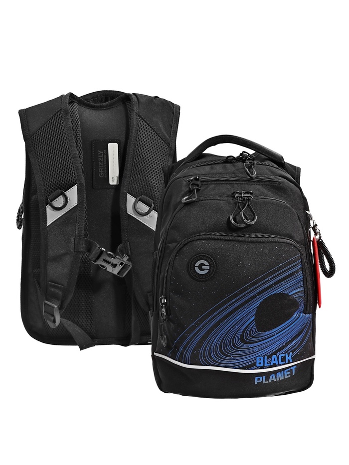 Рюкзак школьный, 38×28×18 см, Grizzly, эргономичная спинка, брелок, чёрный