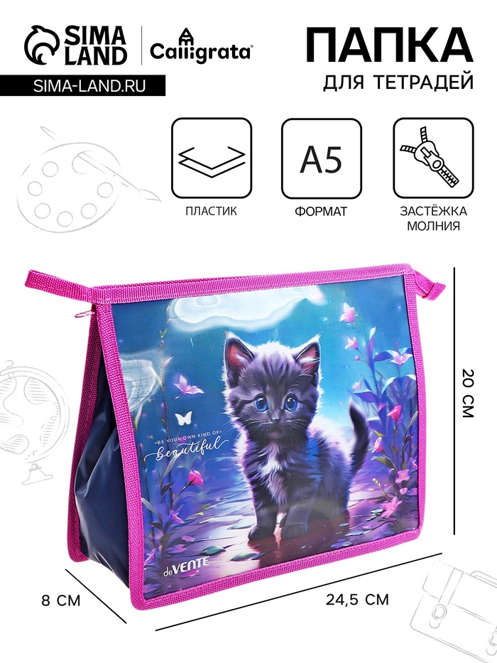 Папка для тетрадей А5, 243x200x80 мм, deVENTE "Beautiful Cat", молния сверху, пластиковая, для девочки